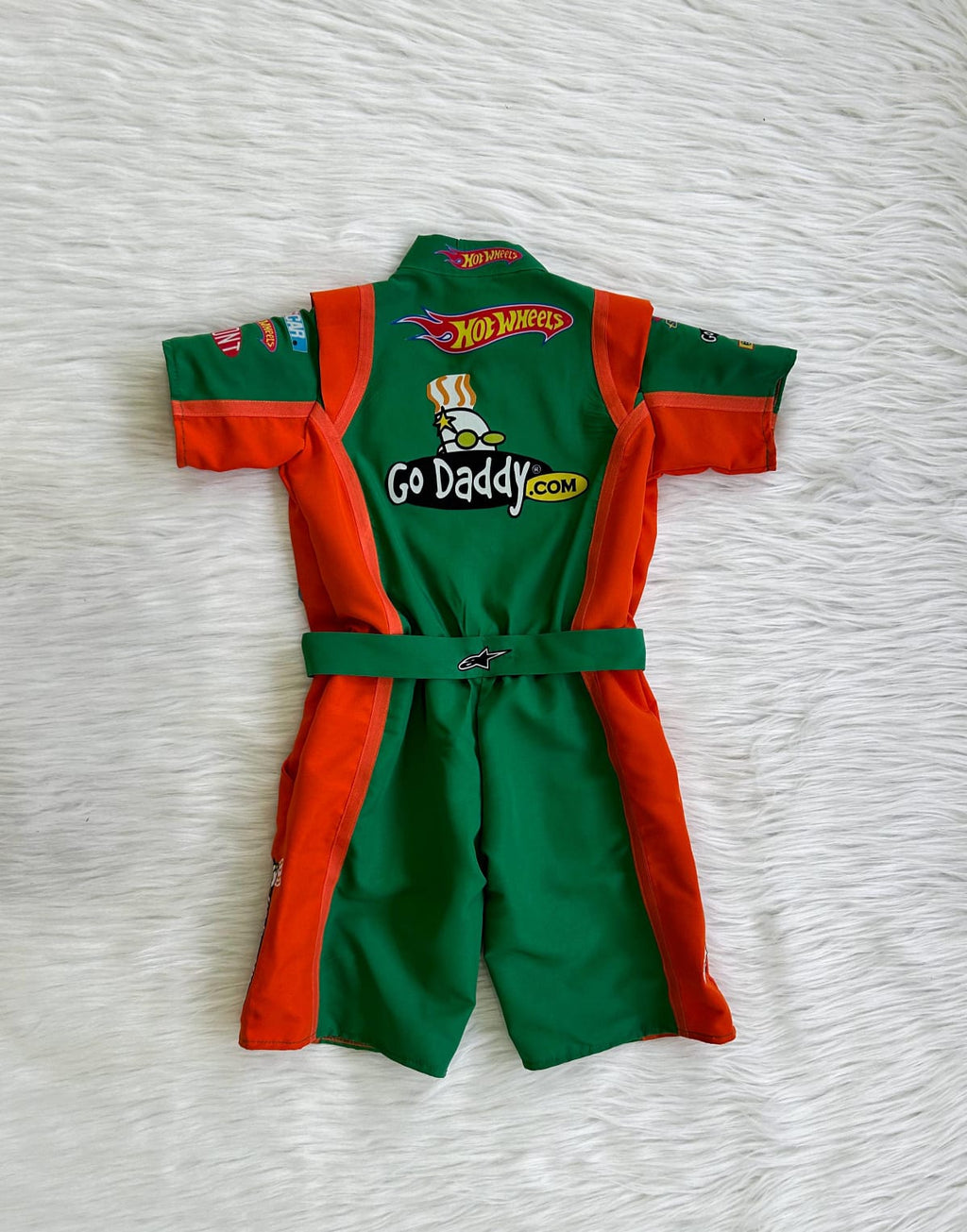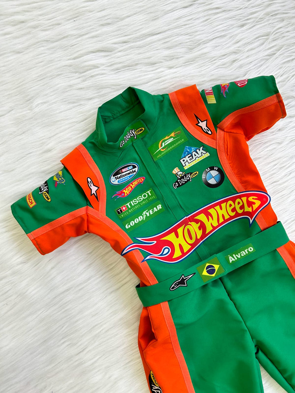 Macacão temático inspirado no universo das corridas, confeccionado em tactel 100% poliéster, proporcionando conforto, resistência e estilo.